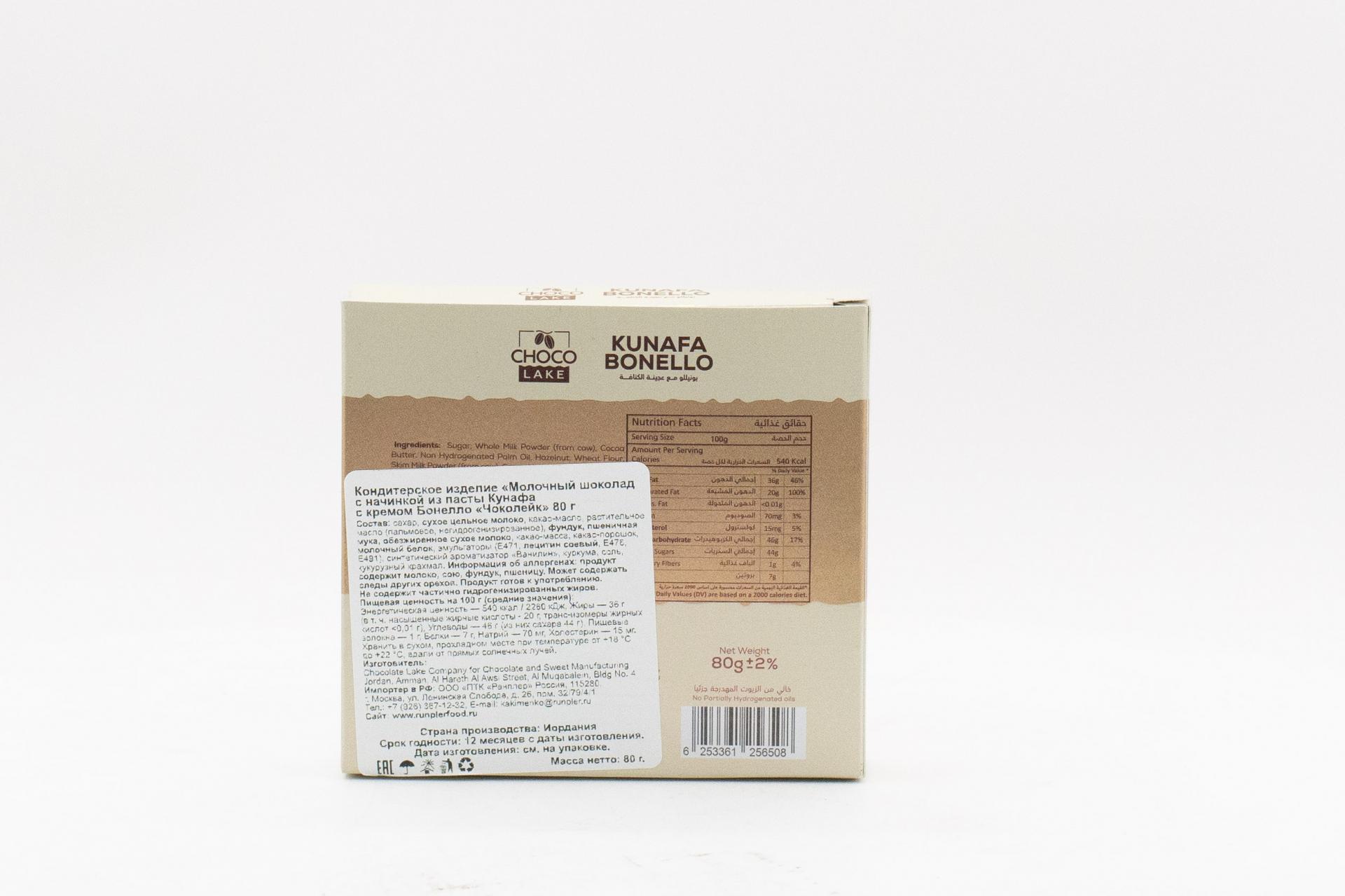 Молочный шоколад без сахара ра Choco Lake с начинкой из пасты Кунафа с кремом Бонелло (Иордания) 80г